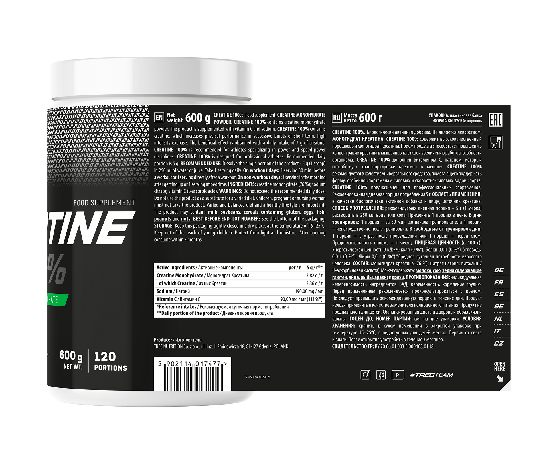 TREC Creatine 100% enthält reines Kreatin, das gezielt die körperliche Leistung bei wiederholten kurzen, intensiven Belastungen steigert. Für optimale Ergebnisse nehmen Sie täglich 5 g, gelöst in 250 ml Wasser oder Saft. Sportler im Kraft- und Schnellkraftbereich profitieren besonders von der Einnahme 30 Minuten vor oder unmittelbar nach dem Training. An trainingsfreien Tagen empfiehlt sich die Einnahme morgens oder vor dem Schlafengehen. Dieses Produkt aus der GOLD CORE LINE unterstützt professionelle Athleten effektiv bei der Leistungssteigerung.