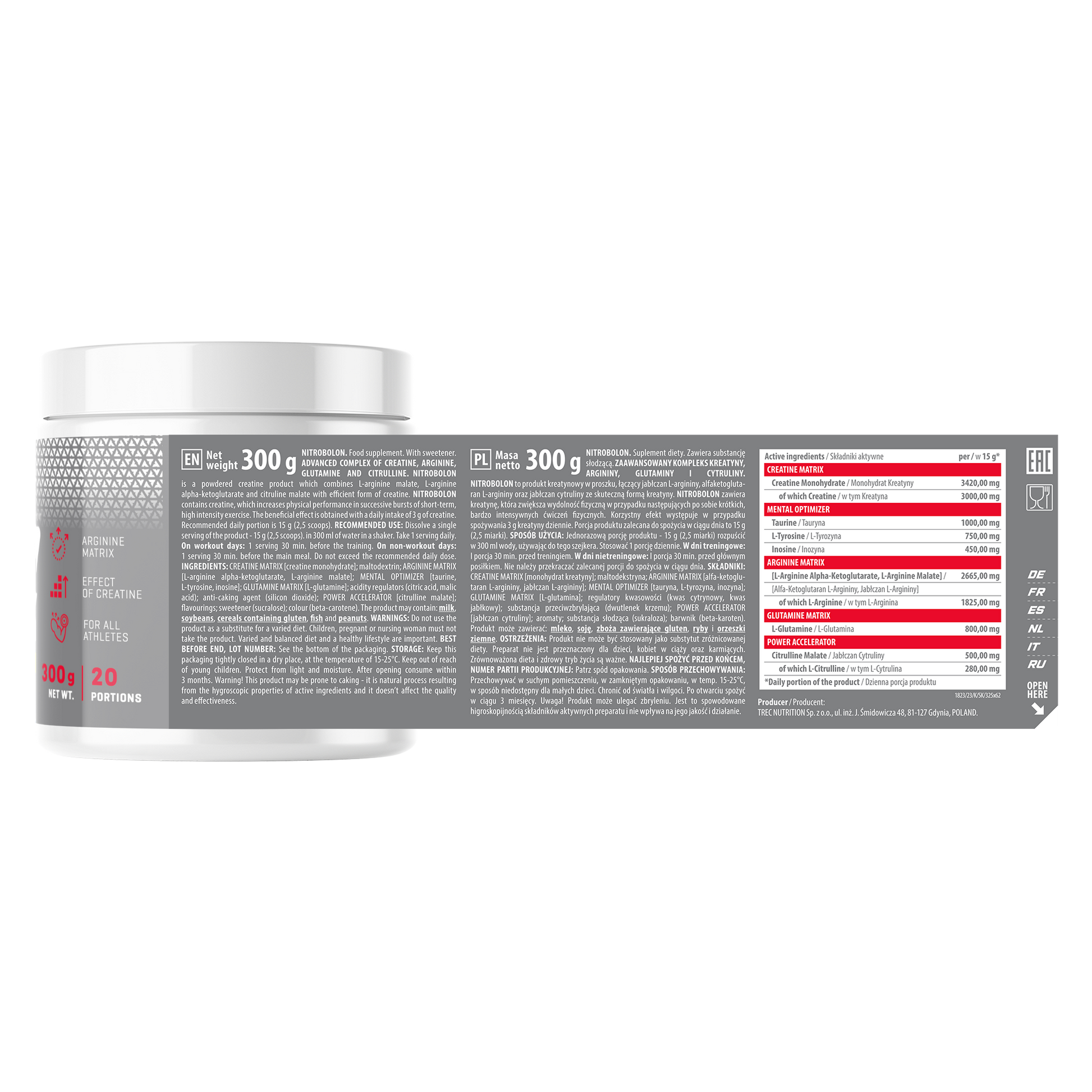 NITROBOLON ist ein Kreatinpulver, das L-Argininmalat, L-Arginin-Alpha-Ketoglutarat und Citrullinmalat mit einer leistungsstarken Kreatinform vereint. Es unterstützt die Steigerung der körperlichen Leistungsfähigkeit bei wiederholten, intensiven Belastungen. Eine tägliche Zufuhr von 3 g Kreatin fördert diese Wirkung. Die empfohlene Dosierung beträgt 15 g (2,5 Messlöffel), die in 300 ml Wasser aufgelöst und täglich eingenommen werden sollte. An Trainingstagen 30 Minuten vor dem Training, an trainingsfreien Tagen 30 Minuten vor der Hauptmahlzeit.