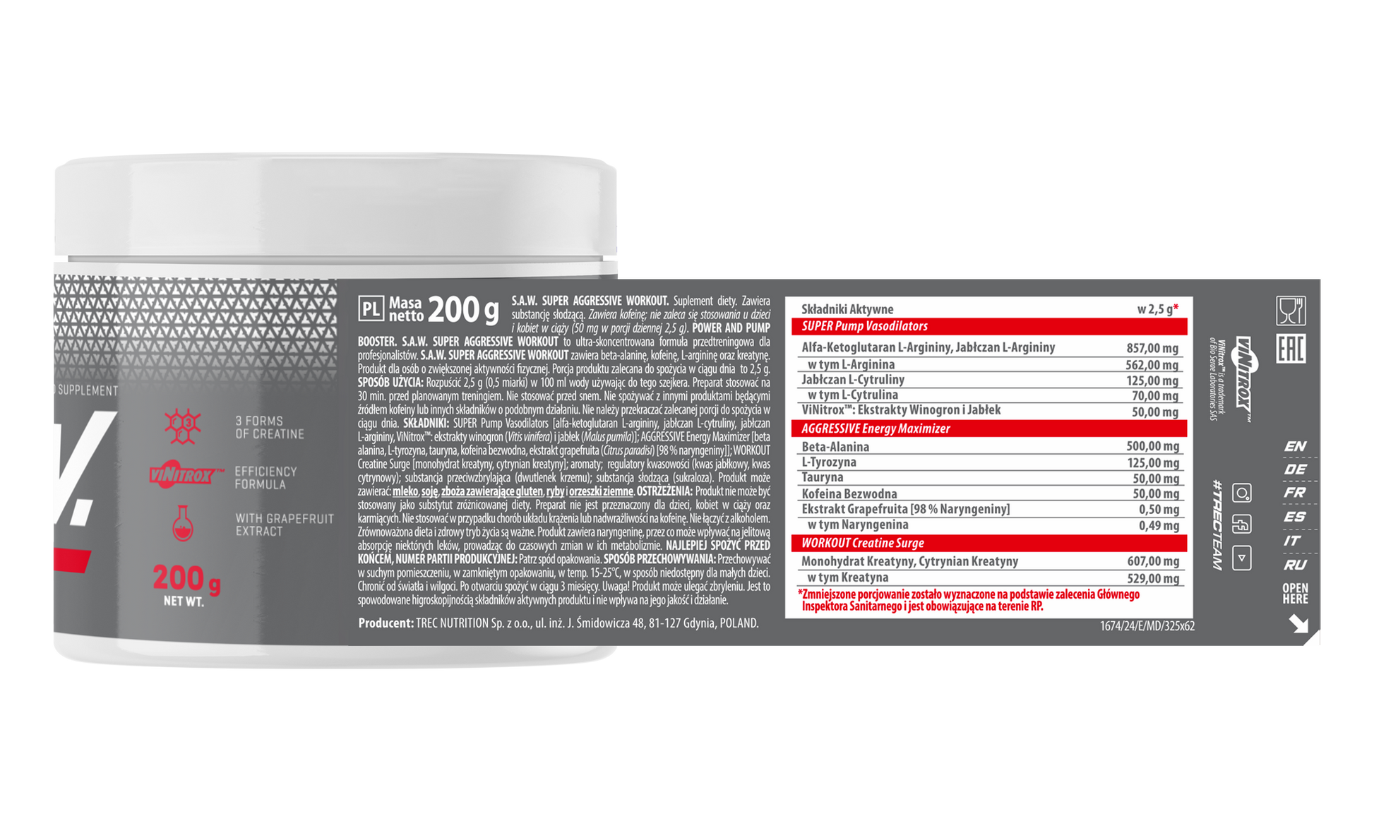 TREC Booster S.A.W ist ein hochkonzentriertes Pre-Workout-Nahrungsergänzungsmittel, das speziell für professionelle Sportler und Personen mit intensiver körperlicher Aktivität entwickelt wurde. Die Formel kombiniert Beta-Alanin, Koffein (50 mg pro Tagesdosis von 2,5 g), L-Arginin und Kreatin, um Energie, Ausdauer und Leistungsfähigkeit zu steigern. Aufgrund des Koffeingehalts wird das Produkt nicht für Kinder und Schwangere empfohlen. Die empfohlene Tagesdosis beträgt 2,5 g. Enthält Süßstoff.
