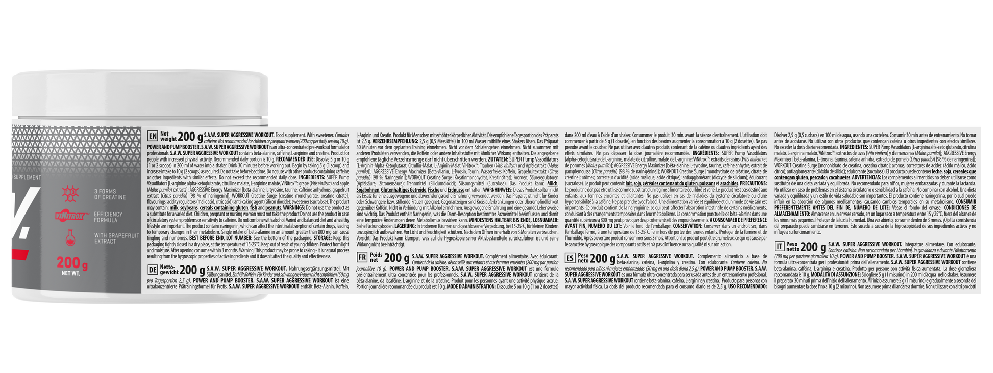 SUPER Pump Vasodilatatoren [L-Arginin-alpha-Ketoglutarat; L-Citrullin-Malat; L-Arginin-Malat; ViNitrox™: Extrakte aus Trauben(Vitis vinifera)und Äpfeln(Malus pumila)]]; AGGRESSIVER Energiemaximierer [Beta-Alanin; L-Tyrosin; Taurin; Koffein wasserfrei;Grapefruit-Extrakt (Citrus paradisi)[98 % Naringenin]]; TRAINING Creatine Surge [Kreatinmonohydrat; Kreatincitrat]; Aromen; Säureregulatoren (Apfelsäure, Zitronensäure); Trennmittel (Siliziumdioxid); Süßstoff (Sucralose). Das Produkt kann enthalten:Milch,Soja,glutenhaltiges Getreide,FischundErdnüsse.