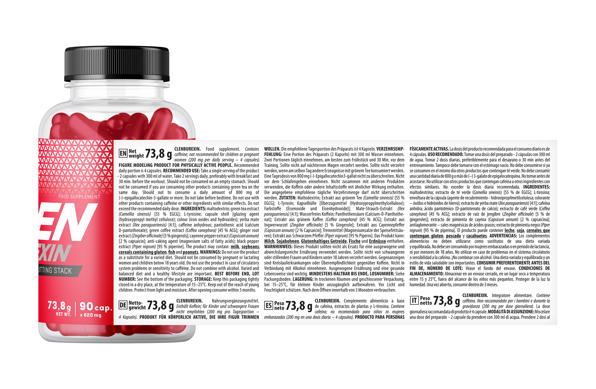 CLENBUREXIN ist eine gezielte Kombination natürlicher thermogener Inhaltsstoffe, Vitamine und Koffein, die den Energiestoffwechsel unterstützt und Müdigkeit reduziert. Pantothensäure trägt dabei zu einem normalen Energiehaushalt bei. Das Produkt eignet sich sowohl für aktive Personen als auch für solche mit geringerer Bewegung. Die empfohlene Tagesdosis beträgt 4 Kapseln, idealerweise aufgeteilt in zwei Portionen: jeweils 2 Kapseln mit 300 ml Wasser, zum Frühstück und 30 Minuten vor dem Training. Die Einnahme sollte nicht auf nüchternen Magen erfolgen.