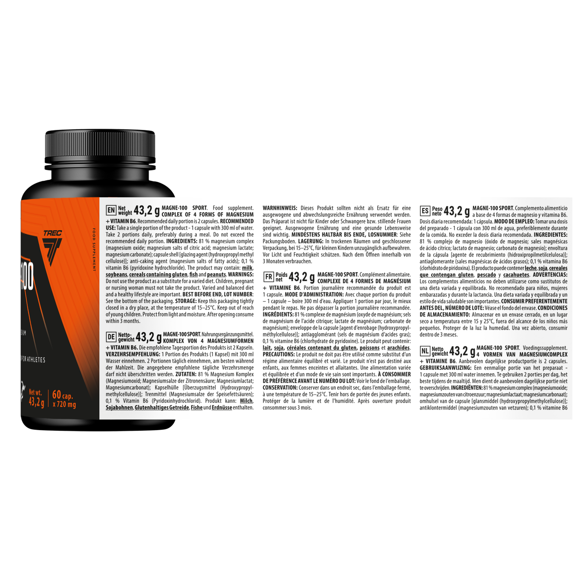 81 %Magnesiumkomplex (Magnesiumoxid; Magnesiumsalze der Zitronensäure; Magnesiumlactat; Magnesiumcarbonat); Kapselhülle [Überzugsmittel (Hydroxypropylmethylcellulose)]; Trennmittel (Magnesiumsalze von Fettsäuren); 0,1 % Vitamin B6 (Pyridoxinhydrochlorid). Das Produkt kann enthalten:Milch,Soja,glutenhaltiges Getreide,FischundErdnüsse.